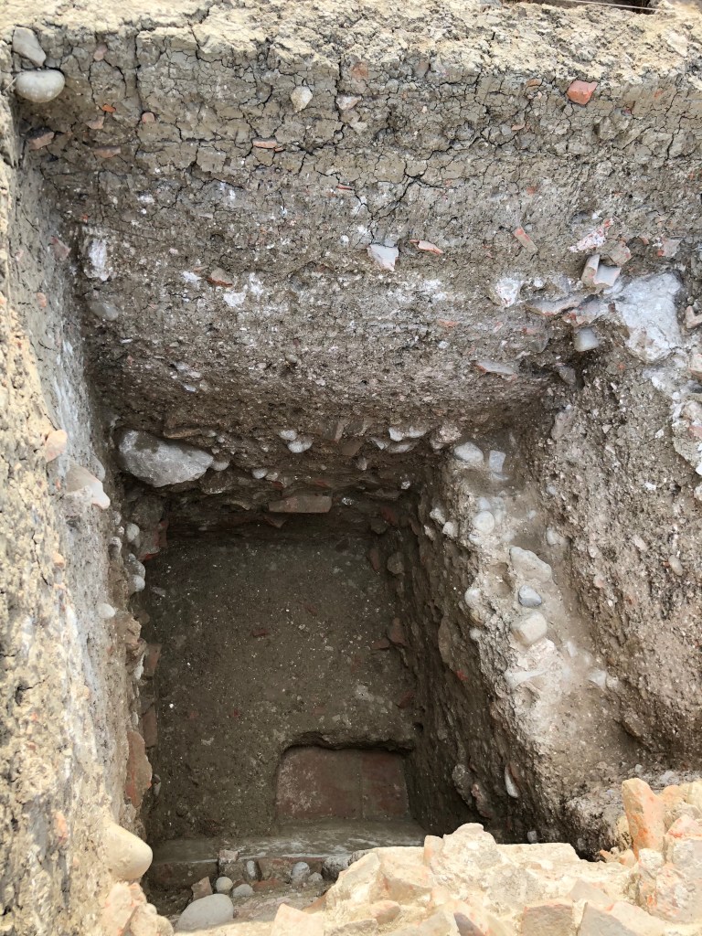 The fourth season of excavations at the Vaiano-Gioiella Villa site took place during June and July of 2019 with work continuing in both the Central Area and the Bath House. In the Central Area, we expanded to the south and concentrated on clearing the layers of fill inside the structure first identified in 2018. By the end of the 2019 season, we had uncovered the eastern and northern walls of a monumental building, which we are now identifying as a Roman nymphaeum. This structure appears to have gone through at least three architectural phases and is connected to the ‘stairway’ to the north that was uncovered in 2017. The northeastern corner of the building may also have served as the foundation for the much later north-south concrete wall also excavated in 2017. Towards that corner, at the end of the 2018 season—on the last day of the season—we reached a small section (ca. 30 cm x 30 cm) of tile flooring nearly two meters below the modern ground level. This floor was cemented against what appeared to be a segment of a thick-walled cocciopesto (i.e., waterproof) basin.