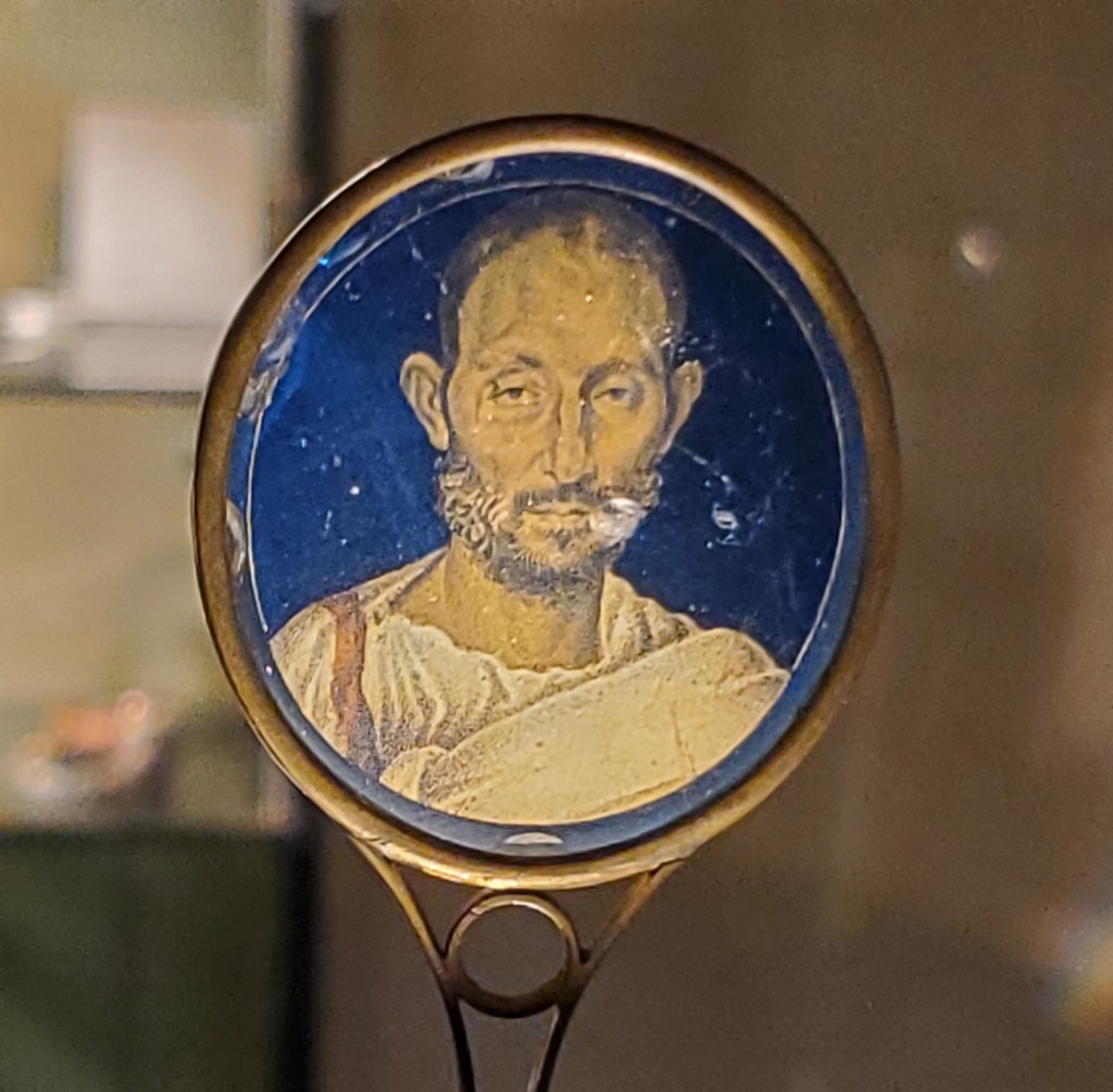 When we visited the Archaeological Museum during our trip to Arezzo, I was struck by a certain small object: a glass medallion, the bottom of a vessel, with a portrait made of thin layers of gold leaf between discs of glass. It and other extant examples of this technique, a method that dates to the Hellenistic period, tend to date to between the third and fifth centuries AD, during the later period of the Roman Empire (Lutraan 2006, 2).