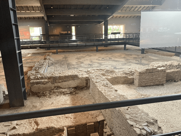 Prior to starting our dig this season, my fellow students and I had the opportunity to visit several Etruscan, Umbrian, and Roman sites throughout Umbria in order to get a better understanding of the history and archaeology of the region. One of these sites was in the city of Spello—known as Hispellum in ancient times—which began as an Umbrian center before becoming a Roman municipality in the first century BC. Just outside of the town walls sits the Villa dei Mosaici, a monumental, late-imperial Roman villa complex discovered in 2005. The villa has twenty identified rooms, many of which boast splendidly preserved mosaic floors that depict geometric patterns, iconographic images, and nature scenes. A museum was built around the site following the excavations and restorations, ensuring its protection and allowing visitors to view the different rooms and mosaics from catwalks.