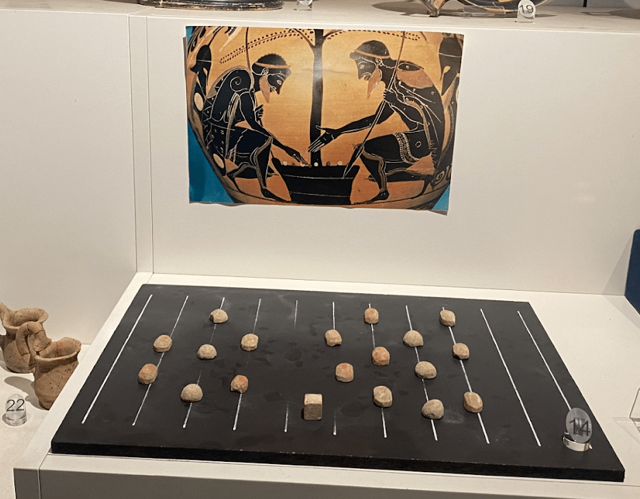 Scattered throughout the museums located in the Castiglione Del Lago region we have viewed many examples of painted Etruscan poetry. One amphora in particular caught my eye—it displayed a popular scene of Achilles and Ajax playing a board game during a break in the Trojan War (Fig. 1), displayed in the Archaeological Museum of Chiusi. I became curious as to what game they were playing and if any modern games were similar.