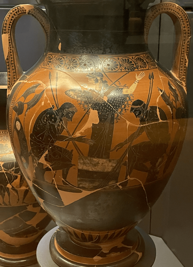 In the depiction shown on the amphora in Chiusi it is not clear who is currently winning the game, as no game pieces are visible. The interruption and halt of the game by Athena shown may symbolize no true end to the match, foreshadowing the deaths of Achilles and Ajax, as neither truly wins the war. Appearing at the game could also be interpreted as an attempt to provide Achilles with wisdom, as she was his mentor throughout the Trojan war. In addition, Athena acts as the goddess of strategy. Looking at some examples of the over 160 vases depicting the same scene, I noticed that the inclusion of Athena was unique to the Chiusi amphora. Perhaps the Etruscan who purchased this vase also believed that there is no true winner in war, or thought higher beings affected the outcomes of wars. Or perhaps they simply liked Athena.