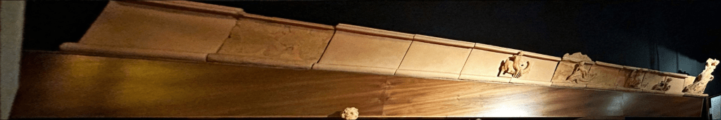 On my visit to the Chianciano Terme Archaeological Museum, I was fortunate enough to view the Etruscan temple’s reconstruction, artfully installed within an adapted palazzo from the 19th century. The reconstruction, a mix of original and replacement terracotta tiles, soars two stories and is overlooked by a viewing platform above. Only the right side of the pediment survives, the rest likely destroyed by a landslide. The temple remains were determined to have been deliberately dumped along the hillside, following its destruction during the 1st century CE (Rastrelli 1993, 465). To the right, a small reconstruction of the temple’s entirety illustrates its condition during the mid-2nd century BCE. This date has been concluded as the terminus post quem of the temple, due to the discovery of a coin from this period during the excavation (Rastrelli 1993, 464).