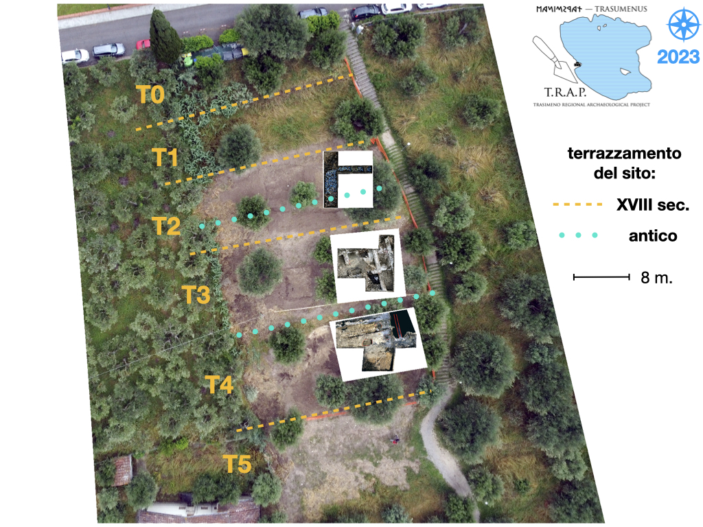 After the Roman period the slope was re-terraced at least twice: once in the Middle Ages for vines and again in the late 1700s for the olive grove the currently occupies the site. The intensity of that activity was presumed to have destroyed previous occupation on the slope. However, it now appears that the most recent terracing was accomplished by filling in the earlier terraces and then recutting them, effectively preserving the earlier occupation phases. In 2023, TRAP excavated on three of the six terraces in order to determine the extent of the site and to understand better the function of the arched terrace wall on fourth terrace (T4).