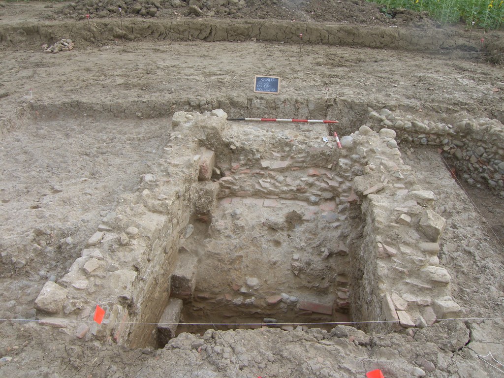 The Central Area of the villa is occupied by a large Roman nymphaeum that was likely constructed between the late 1st century and early 2nd century AD. The structure is 6.5 m wide and at least 8.30 m long (we never uncovered the south end). It has a north-south orientation and likely would have been open on the south side, providing a view directly towards Chiusi. The interior plan of the building comprises a series of niches alternating with pillars. At the north end there is a ‘stairway’ that descends into the space. The lower wall of the structure is made of a thick cocciopesto that is mortared into the tile flooring, making the entire space water-proof and forming a large pool. The niches are decorated with a rough plaster that includes small pieces of limestone and blue-glass tesserae, which would have sparkled when the sunlight reflected off the water. To contrast with the cave-like effect of the niches, the pillasters were covered in fresco decoration painted in alternating solid colors such as yellow, red, white, and black. The “stairway” at the back may have been part of the decoration, allowing water to flow into the pool.